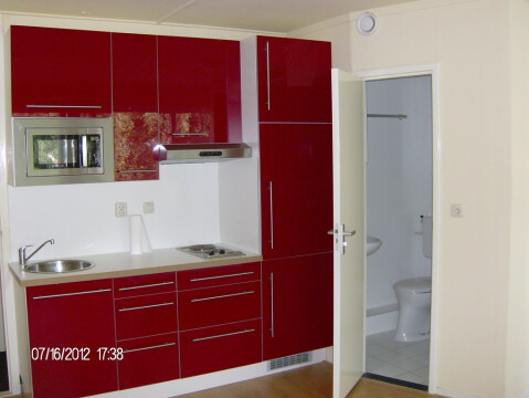 De studio is voorzien van een eigen badkamer met douche toilet en wastafel. De keuken is gelegen in de studio en is v.v. inbouwapparatuur: koelkast, magnetron, afzuigkap en 2 pits elektrische kookplaat. Deze studio is zelfstandig en er kan eventueel huurtoeslag aangevraagd worden. Daarnaast staat er een wasmachine en droger beneden in de hal waar gezamenlijk gebruik van wordt gemaakt.